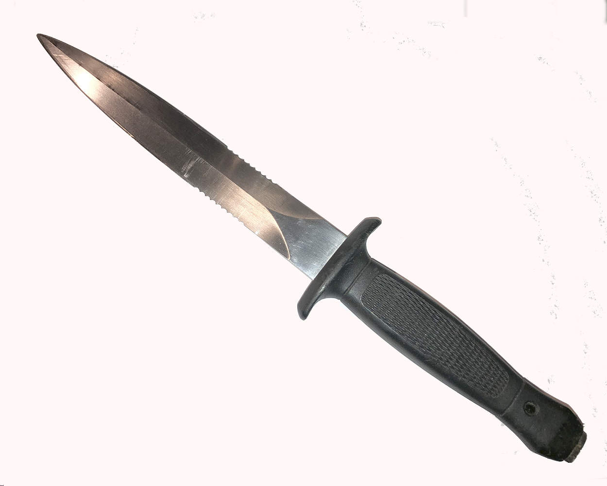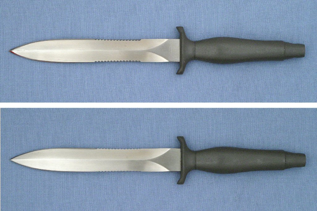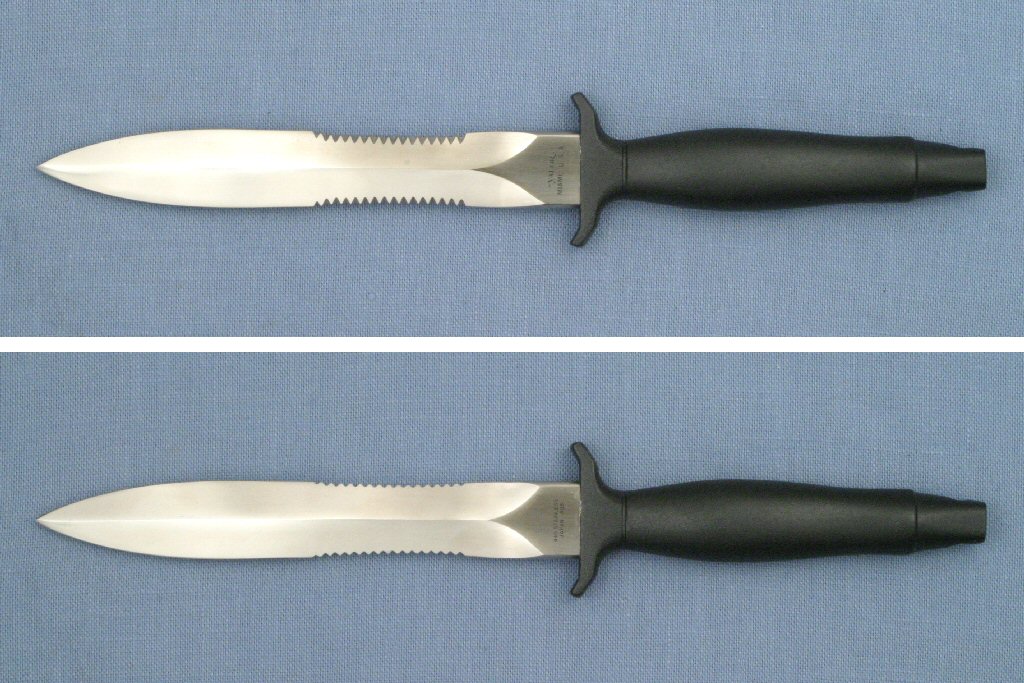 The 440 stainless steel blade has the straight blade profile with 8 teeth-per-inch serrations on a two-inch section on both blade edges. The diecast aluminum handle is very similar to the Gerber Mark II handle. The difference is in the shape of the guard with the Explorer having a more rounded guard with tapered tips. The handles are painted dark gray and most show some grind marks and other minor imperfections on the handle surface.
