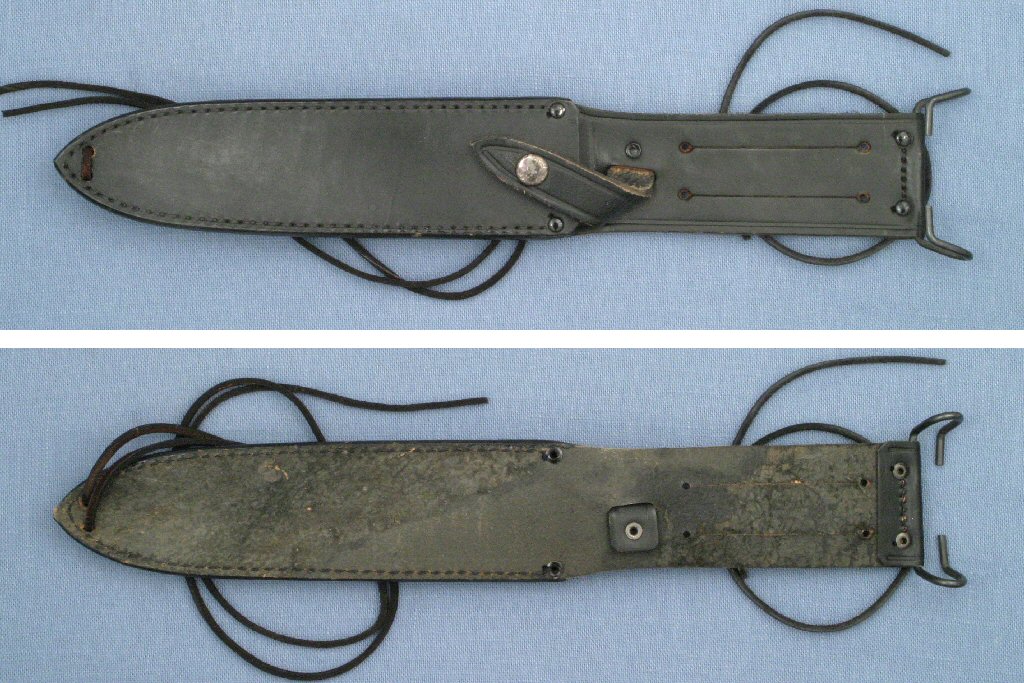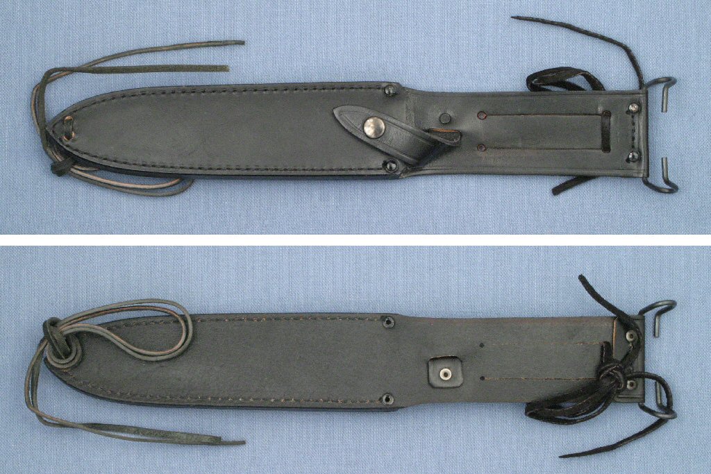 The Explorer Survival II was sold with a black leather sheath that is very similar to the Mark II pointed tip sheaths with military belt hanger. The early sheaths had the extended tab for the leg tie. Later sheaths do not have the tab but have 2 holes near the sheath tip through which the leg tie is threaded. The sheaths are unmarked.