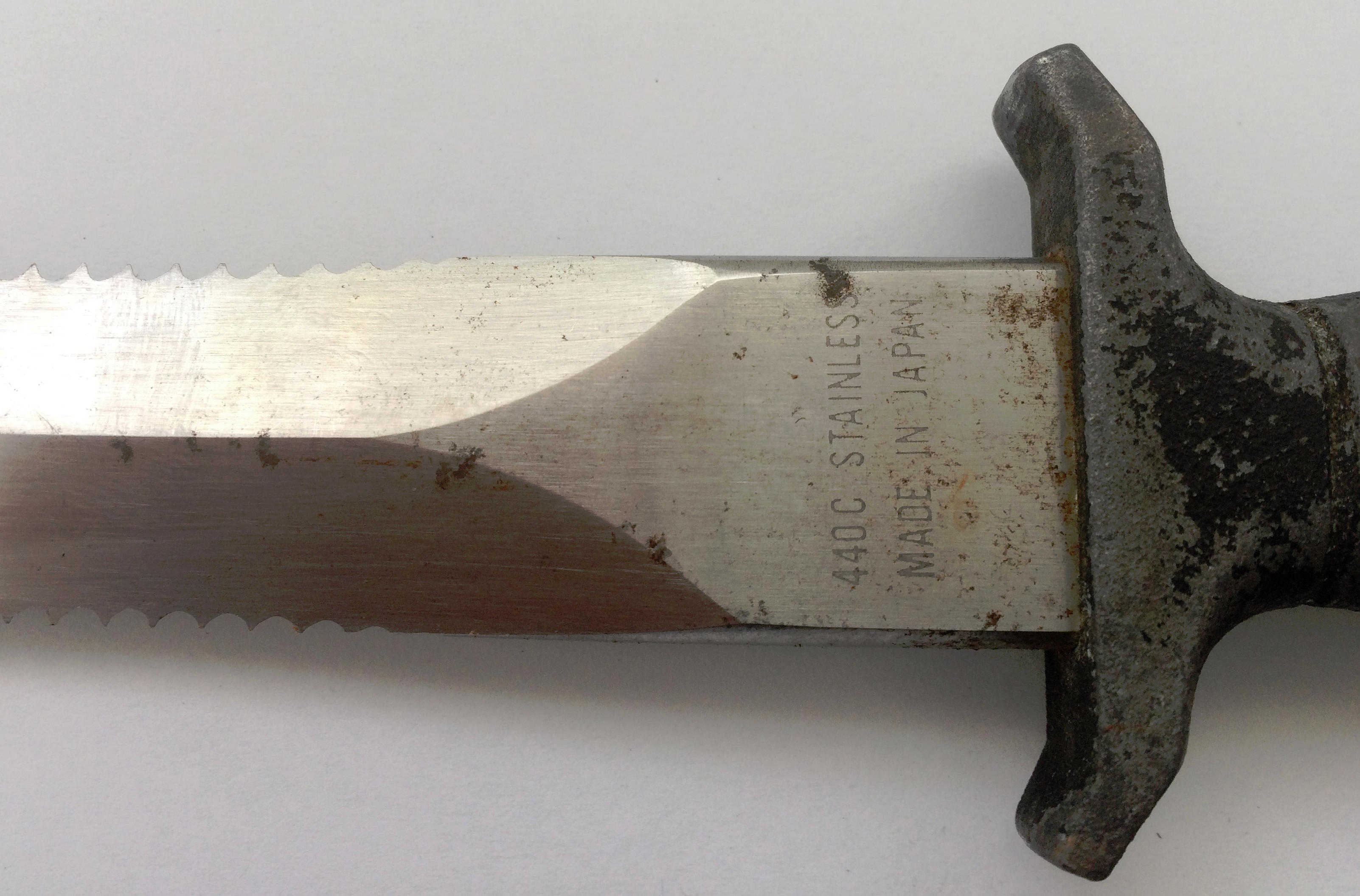 The Explorer Survival II knives are not serial numbered. The blades are of a better quality than the handles, have a brushed finish and have a large electro-etched "EXPLORER / SURVIVAL II" on the blade as well as "440 STAINLESS / 21-041 JAPAN" on one side of the blade ricasso. The opposite side of the ricasso is blank.