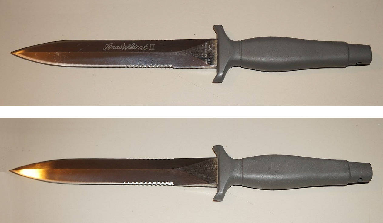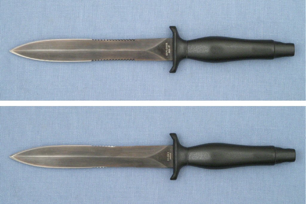 The 440 stainless steel blade has the straight blade profile with 8 teeth-per-inch serrations on a two-inch section on both blade edges. The diecast aluminum handle is very similar to the Gerber Mark II handle. The difference is in the shape of the guard with the Explorer having a more rounded guard with tapered tips. The handles are painted dark gray and most show some grind marks and other minor imperfections on the handle surface.