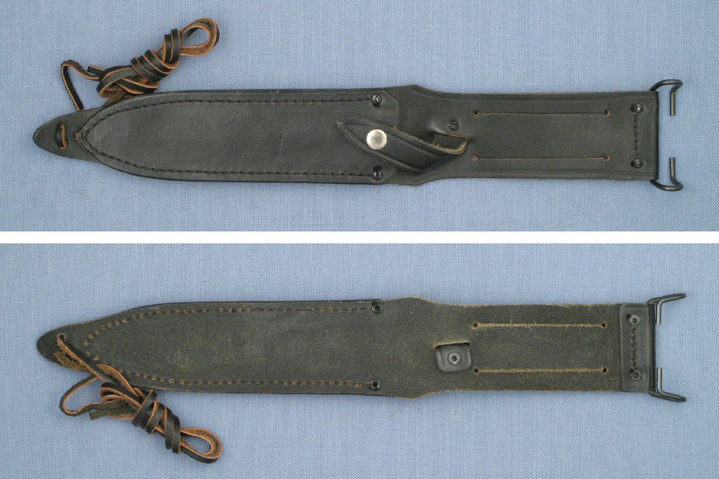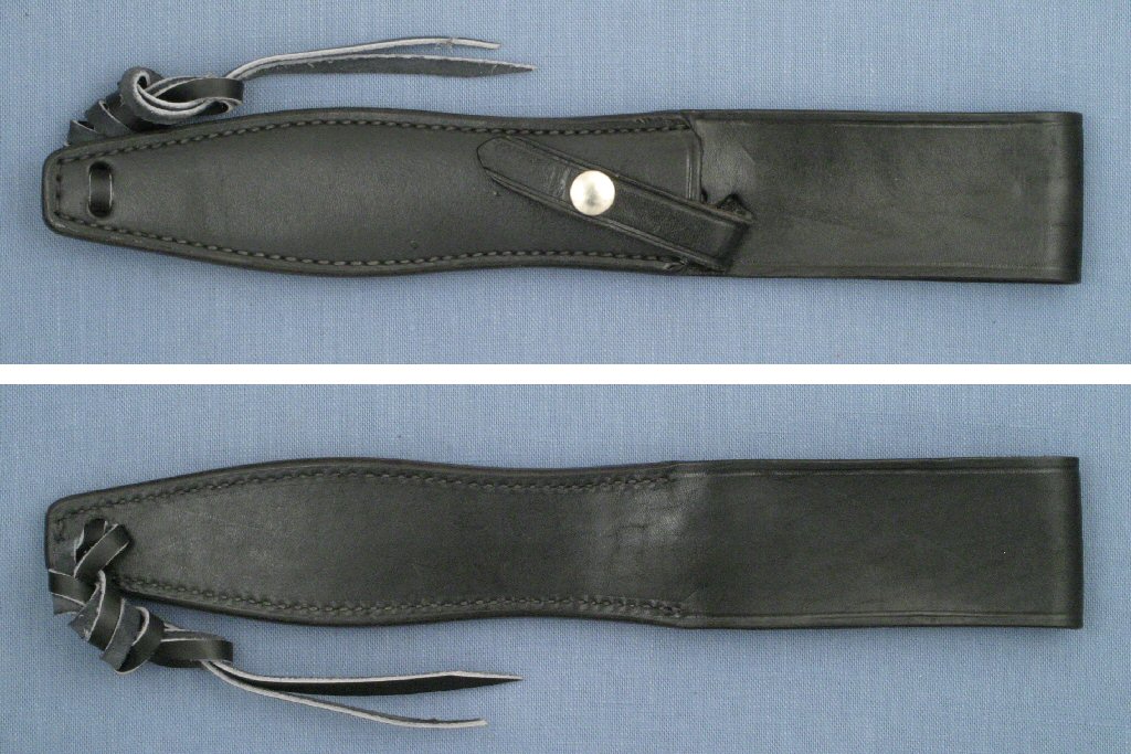 The Explorer Survival II was sold with a black leather sheath that is very similar to the Mark II pointed tip sheaths with military belt hanger. The early sheaths had the extended tab for the leg tie. Later sheaths do not have the tab but have 2 holes near the sheath tip through which the leg tie is threaded. The sheaths are unmarked.
